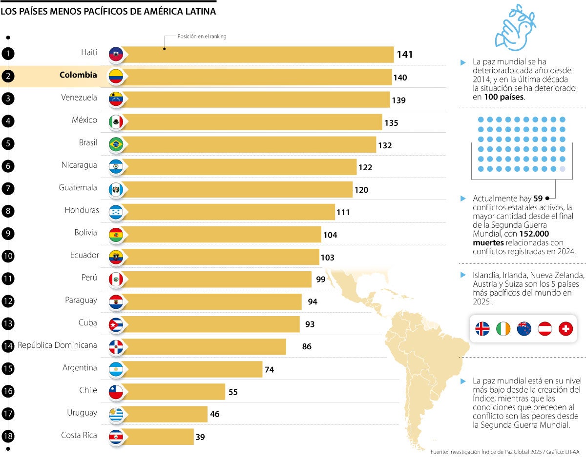 El Índice de Paz Global, GPI, publicado por el Institute for Economics & Peace, IEP, publicó su informe para 2025. Este clasifica a los países según su nivel de paz, evaluando no solo la violencia, sino también la capacidad de las sociedades para mantener la estabilidad en el cual Colombia se ubicó en el puesto 140 en el mundo; pese a que es un aumento de seis puestos respecto al informe presentado en marzo, aún el país es el segundo de América Latina menos pacífico, después de Haití.